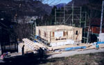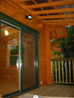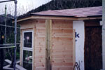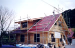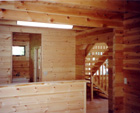 六角形浴室部分はログ本体とは別構造。外観は同じ巾のログパネル貼で統一しました。