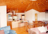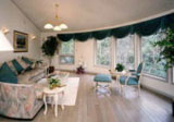 大きな窓が連続していてパノラマの眺望。冬にはストーブの炎がちろちろとロマンティックなくつろぎ空間に。